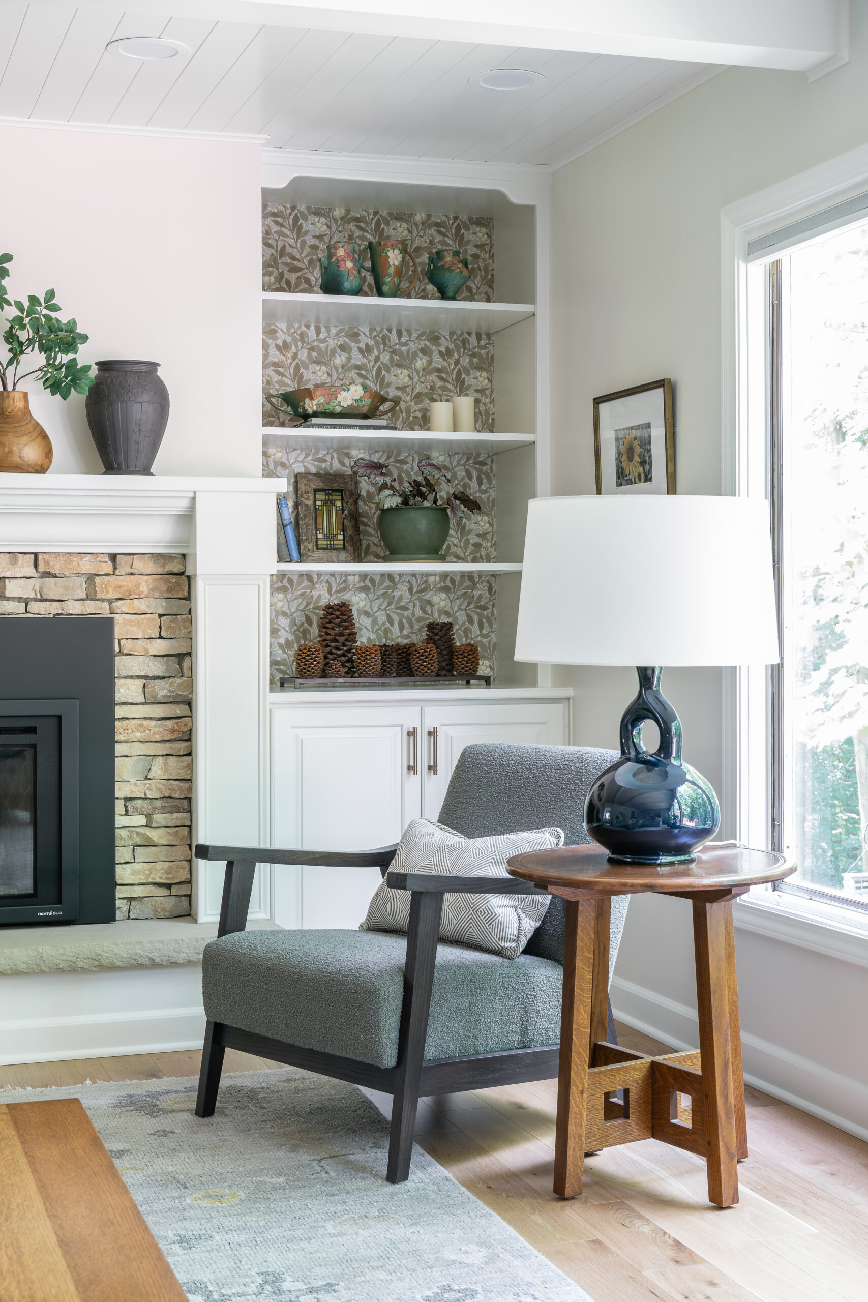 We refreshed both the bedroom and living fireplaces to better align with the clean, natural look we were going for. Then we brightened up the rooms with fresh upholstery on the client’s existing furniture, paint, and other details like a tongue and groove ceiling to add more architectural interest to the living room.
