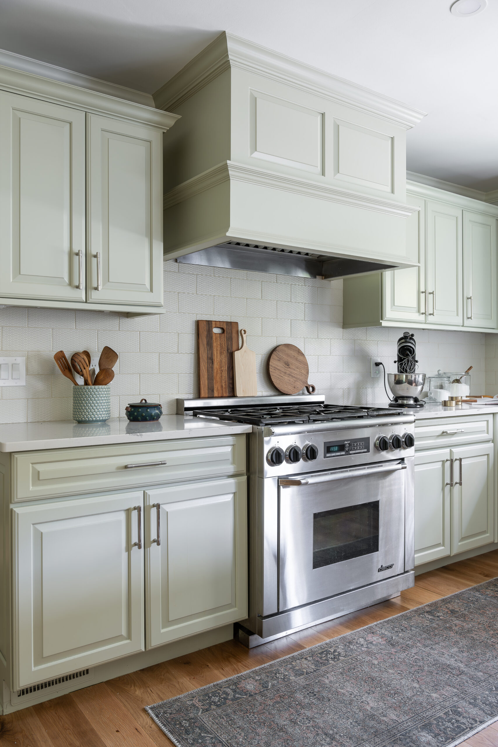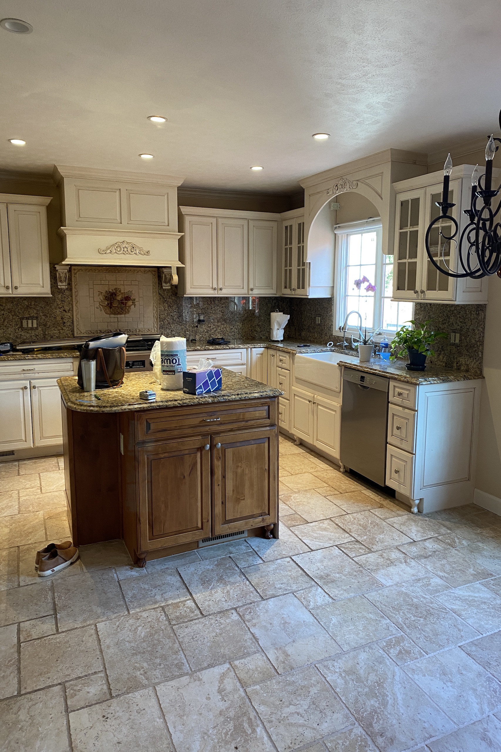 Our client wanted the kitchen to more feel clean and simple compared to where it started, so we removed some of the traditional details, selected all new countertops, cabinet color, backsplash, lighting, and added other new elements like a custom kitchen island and banquette seating.