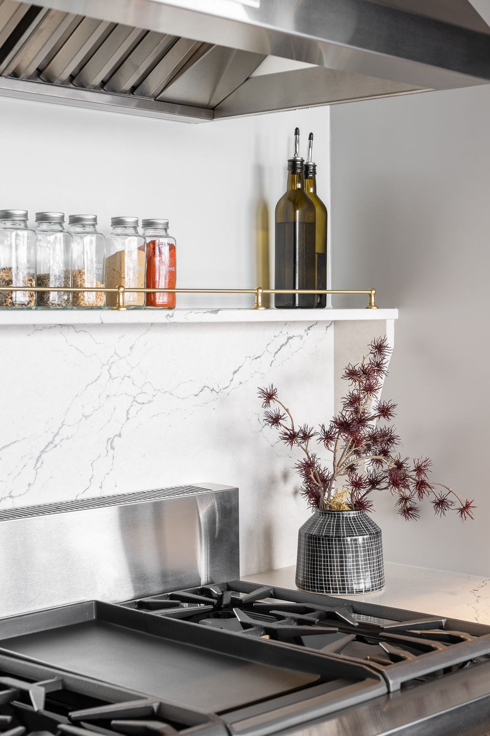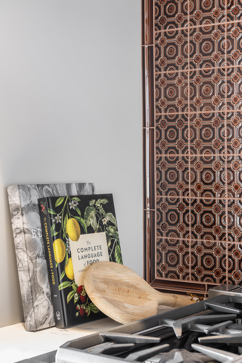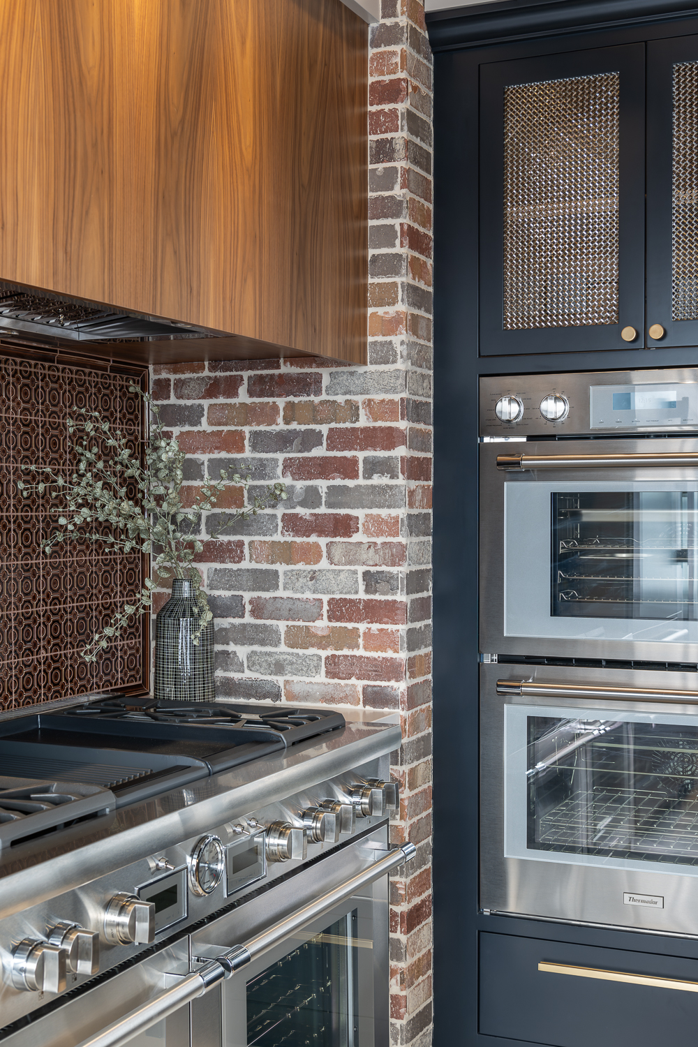 This brick pairs beautifully with the tile backsplash, which is in the same red/brown family as the island and brick. All of these warm tones create a perfect balance with the other black cabinetry, white marble countertops, and luxury stainless steel appliances.