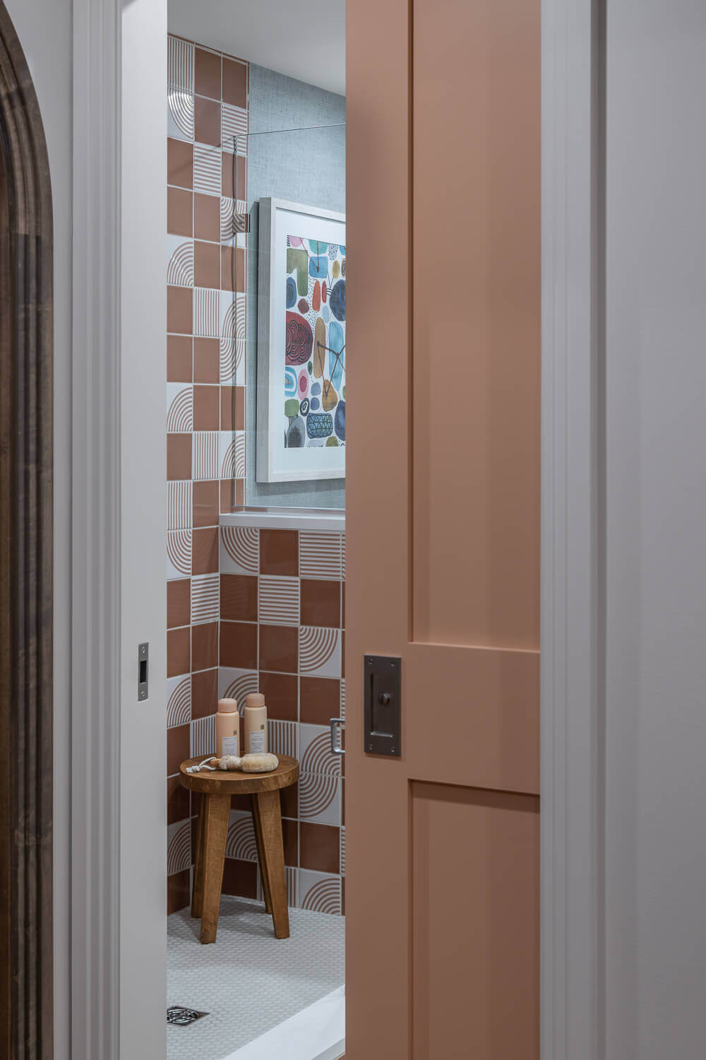 Check out the cozy movie room, complete with comfy theater seating and blackout curtains for the ultimate movie night experience. Down the hall, there’s a charming wine room (right through that stunning arched door!). Here you’ll spot custom floor-to-ceiling shelves that perfectly showcase the family’s growing wine collection. Throughout the entire basement, we’ve embraced playful patterns, from the bathroom tiles to the wallpapers and upholstery. It all comes together to create a warm, inviting atmosphere.