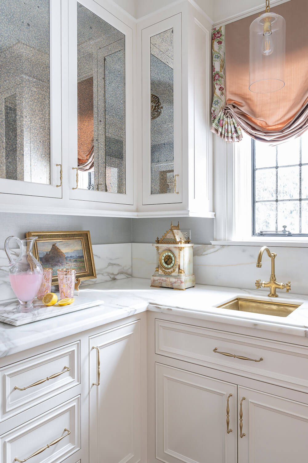 Each room incorporates fixtures, artwork, and furniture from the homeowner’s antique collection. Any “new” elements were intentionally designed or sourced to feel old-world and collected, while still maintaining a sense of lightness and freshness. The cabinetry alone is filled with thoughtful detail. Decorative moldings, furniture-style feet, antiqued glass panels, oversized hardware, and classic cremone bolt locks all work together to create a feel of traditional elegance!