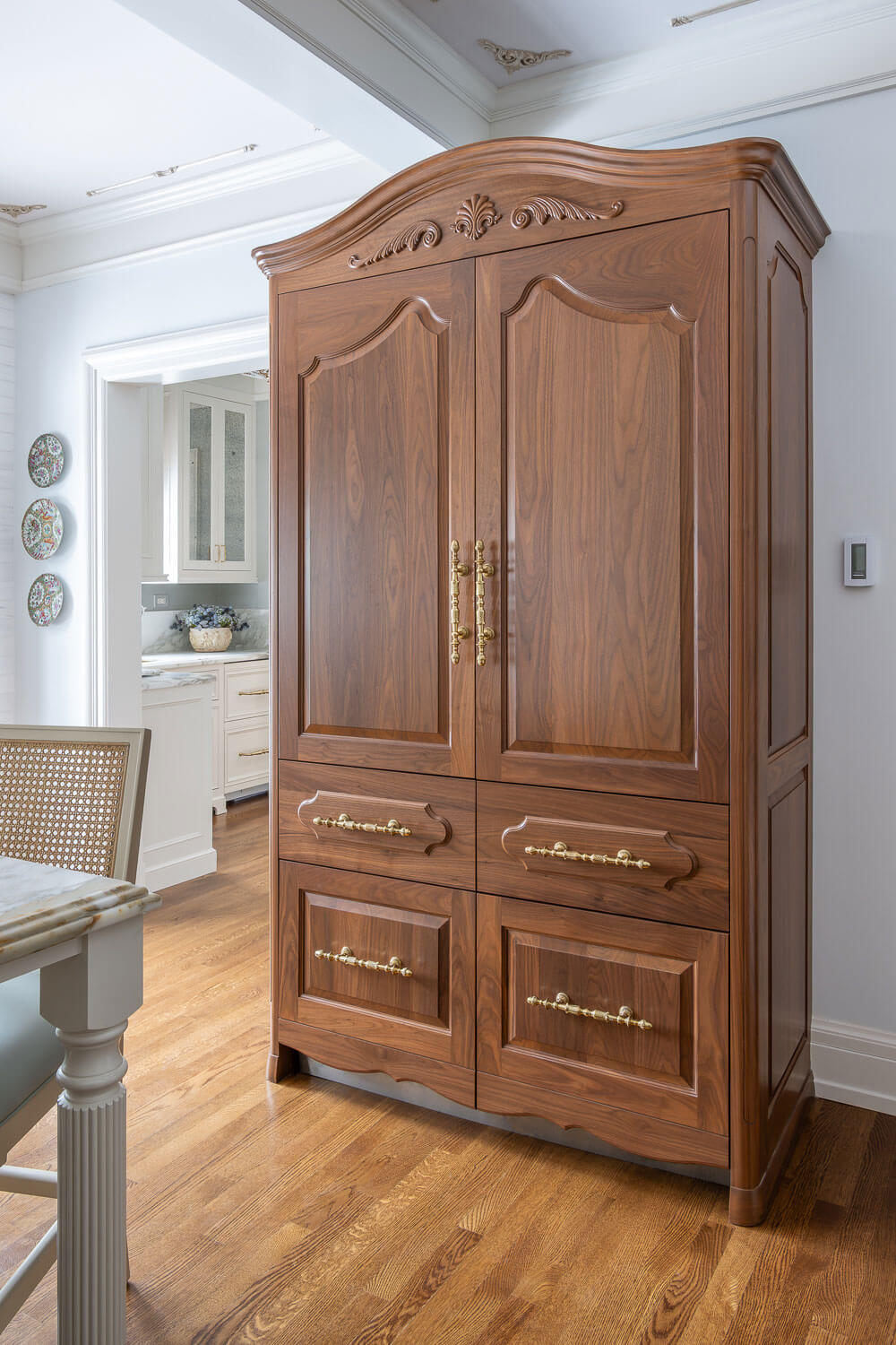 One of our favorite moments in the kitchen is a charming “armoire” that is actually a custom-designed refrigerator. Designed to blend seamlessly into the cabinetry, it feels right at home in this antique French–inspired space!