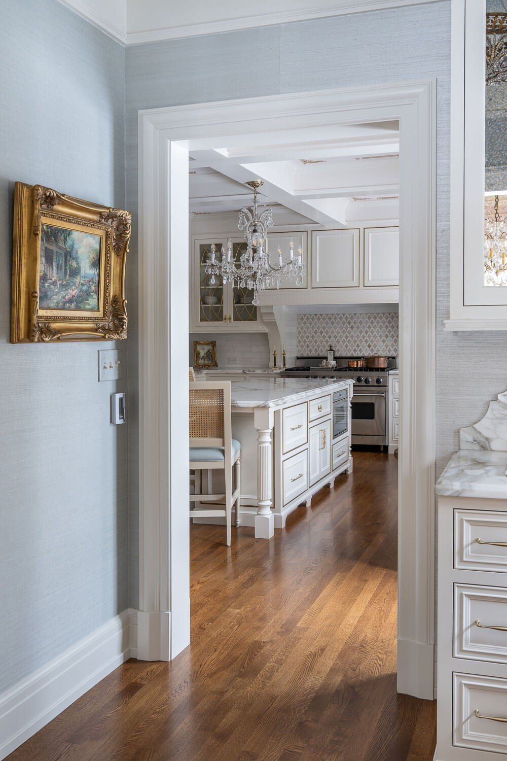 Our goal was to honor the home’s original character while layering in the homeowner’s romantic style. We wanted these spaces to feel timeless for years to come. The homeowners wanted the rooms to feel light and airy, yet still traditional and elegant, in keeping with the rest of the home’s style. The result is a fresh and refined interior, shimmering with ornate details that invite the eye to wander. It’s the perfect setting for showcasing the homeowner’s original artwork and treasured antique collection!