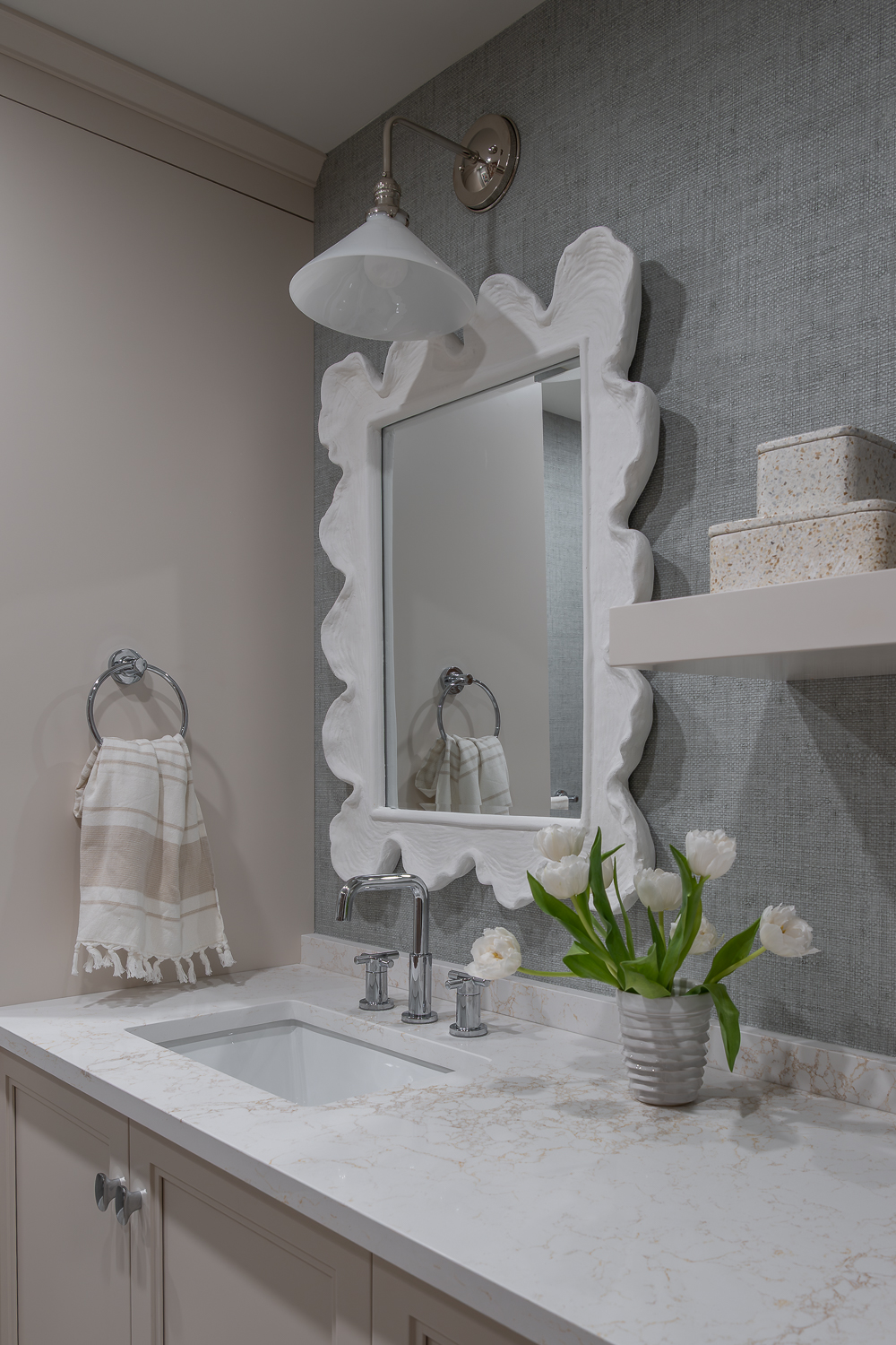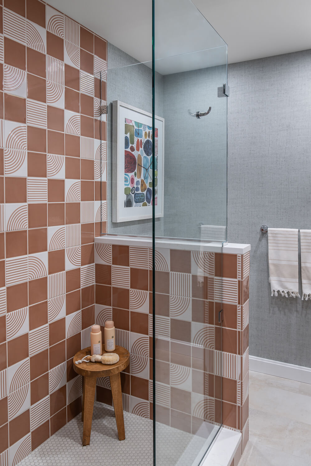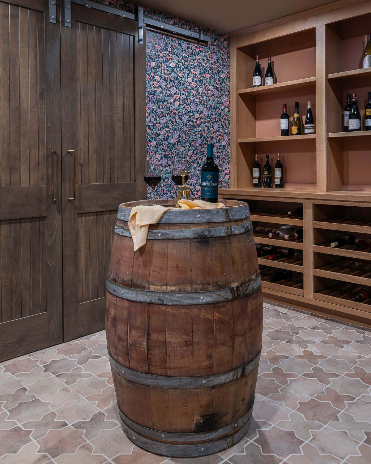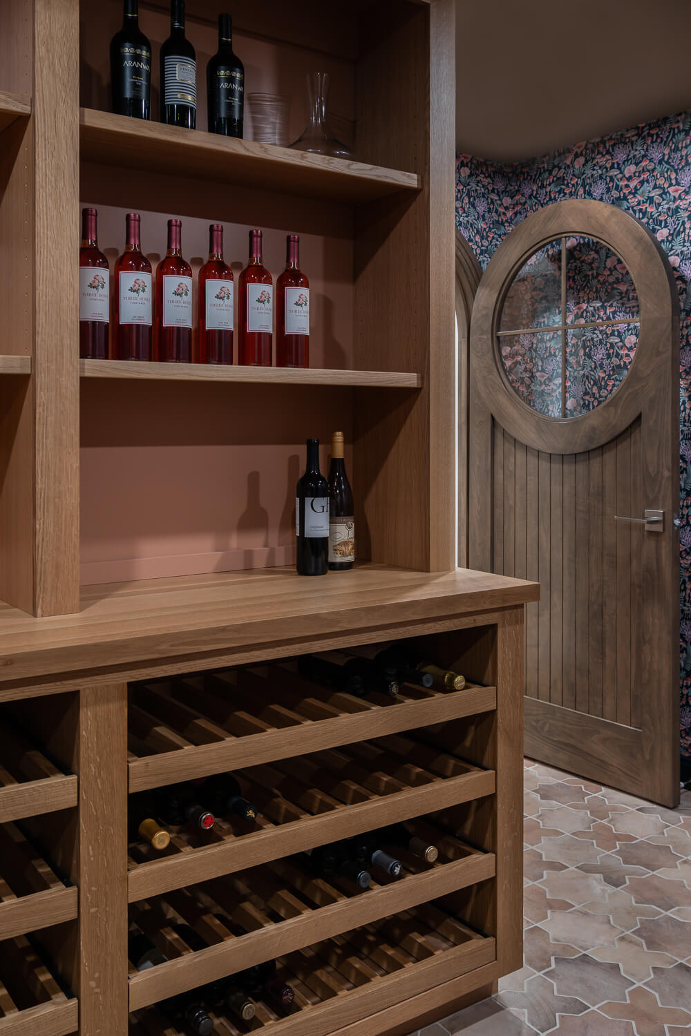 Check out the cozy movie room, complete with comfy theater seating and blackout curtains for the ultimate movie night experience. Down the hall, there’s a charming wine room (right through that stunning arched door!). Here you’ll spot custom floor-to-ceiling shelves that perfectly showcase the family’s growing wine collection. Throughout the entire basement, we’ve embraced playful patterns, from the bathroom tiles to the wallpapers and upholstery. It all comes together to create a warm, inviting atmosphere.