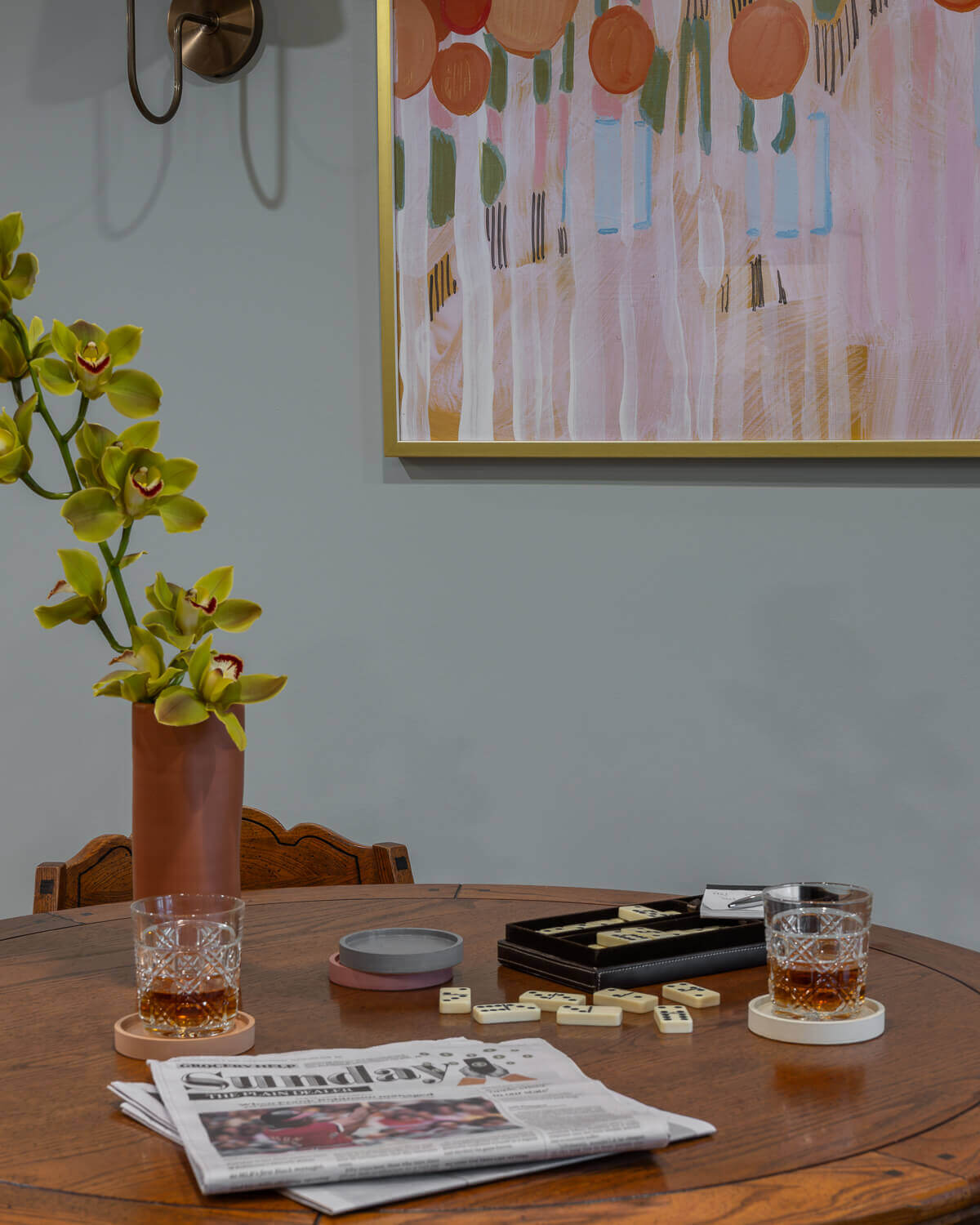 Welcome to our Playful Curations project, located in Chesterland, Ohio. A young family approached us to completely remodel their basement, transforming it from a dark, outdated space into a bright, colorful, and multipurpose area where the whole family could gather. The project involved a full renovation of the bathroom and bar, a complete refresh of the living room and guest room, as well as the addition of a wine room and a movie room for the family to enjoy. Here’s a look at the transformed space!