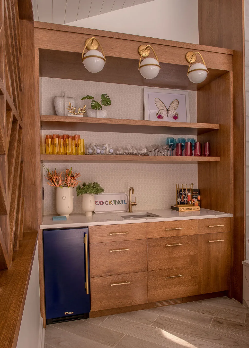 Smart storage to keep stock of all of your essentials can transform a simple bar into a truly luxurious one. Often, we’ll incorporate a mix of open shelving for display-worthy pieces and closed cabinetry for essentials you’d rather keep tucked away. Other five-star details to tie it together and make it feel bespoke include soft-close drawers and statement hardware!